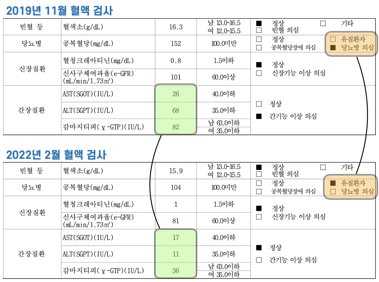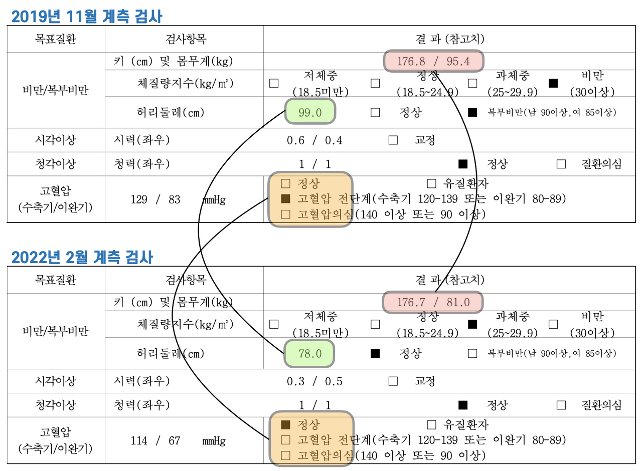 난 당뇨 선고를 받고 3개월 만에 인슐린에서 해방되었다. 마침 2022년은 건강보험공단에서 하는 정기 건강검진을 받는 해였다. 지금까지는 건강검진을 받는 게 귀찮아서 미루고 미루다 연말이 되어서야 억지로 받았었는데 이번에는 당뇨 극복을 위해 열심히 몸 관리를 해 왔던 터라 그 결과에 대한 "건강 성적표"를 하루라도 빨리 받아보고 싶었다. 공부를 열심히 한 학생이 시험을 기다리는 심정이 이런 것일까? 난 다음 병원 예약 날짜에 맞춰 건강검진을 신청했다. 그리고 어제, 지난 2월 15일 받았던 건강검진 결과가 나왔다. 난 성적표를 비교하듯 2019년 11월에 받았던 건강검진 결과와 비교해 보았다.