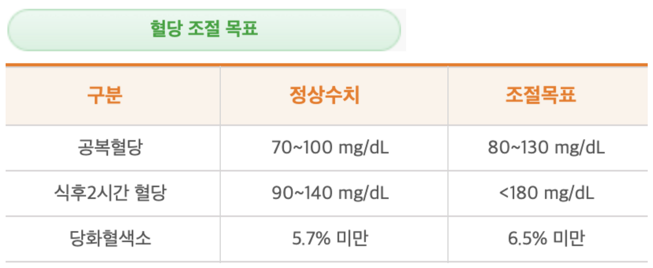 인슐린 주사기에는 인슐린 양을 조절할 수 있는 장치가 되어 있다. 처음엔 의사샘의 처방에 따라 20단위부터 놓기 시작했다. 만약 혈당이 정상수치(일반적인 정상수치와 당뇨환자의 조절 목표는 다르다. 아래, 표 참조)를 넘어가면 다음날엔 2단위를 높여야 하고, 정상수치를 유지하거나 혈당이 낮게 나오면 2단위씩 낮춰가며 맞으면 된다. 그러다가 소위 저혈당이 올 수도 있는데, 그럴 경우에는 4단위를 낮춰야 한다. TV 드라마에서만 보았던 그 무서운 저혈당이 나한테도 올 수 있다고 생각하니 등골이 서늘해졌다.