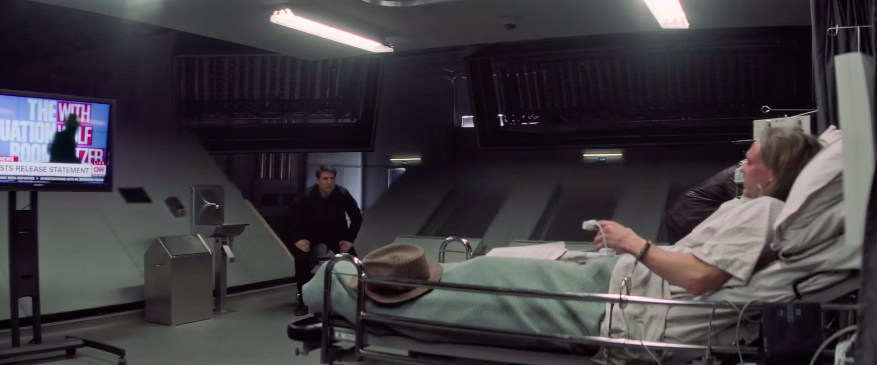 미션 임파서블 "폴아웃"의 인트로... 극단적 아나키스트 델부룩 박사는 존 라크의 선언문을 방송에서 읽어주면 핵무기를 통해 인류 말살 계획을 세우고 있는 존 라크에 대한 정보가 들어있는 휴대폰의 접속 코드를 알려주겠다고 이단(톰 크루즈)를 협박한다. 이단은 분노하지만 어쩔 수 없이 델부룩 박사의 제안을 받아들인다.